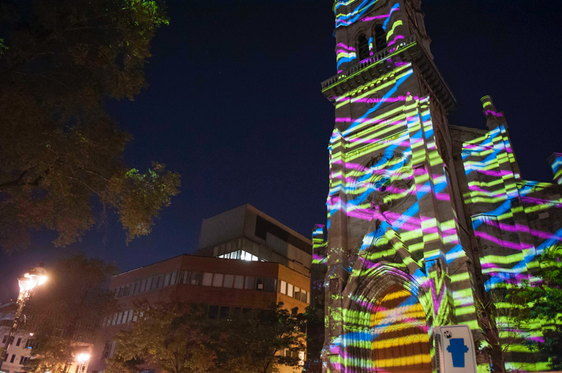 Jusqu’au 1er décembre, le clocher de l’UQAM sera illuminé par le collectif de designers et diplômés en design d’événements Pete & Vegas, en collaboration avec le diplômé Alexandre Dagenais, du programme de médias interactifs.