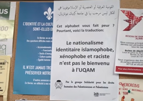 Les réactions n’ont pas tardé. Le groupe Solidarité pour les droits humains des Palestiniennes et Palestiniens de l’UQAM a imprimé et apposé une affiche à côté de celles sur le nationalisme. Leur message stipulait que «le nationalisme identitaire islamophobe, xénophobe et raciste n’était pas le bienvenu à l’UQAM». Le groupe a publié une photo des deux affiches côte-à-côte sur sa page Facebook. «C’était une réponse tout à fait légitime, qui employait le même mode communicationnel», souligne la professeure Meunier.