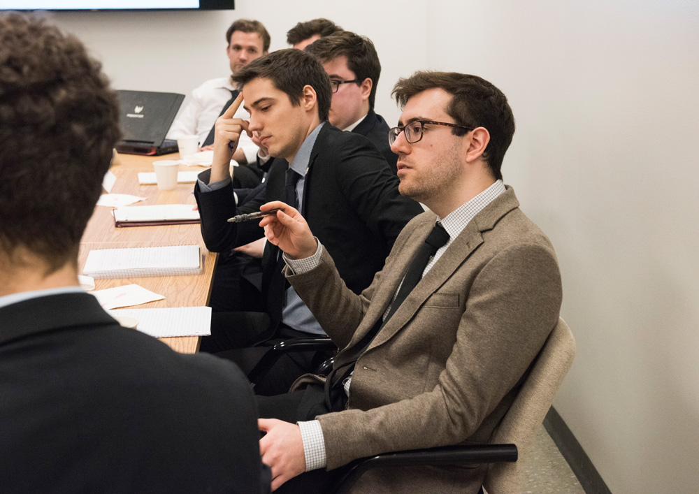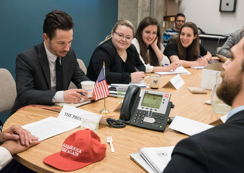 Nous ne sommes pas à la Maison-Blanche, mais c’est tout comme. Dans une salle de réunion de la Chaire Raoul-Dandurand en études stratégiques et diplomatiques, huit candidats à la maîtrise et une doctorante en science politique se prêtent à un jeu de rôle décisionnel dans le cadre du cours Politique extérieure des États-Unis, donné par le professeur Charles-Philippe David en collaboration avec le doctorant Vincent Boucher. François-Xavier Naudan-Raymond et Albert Mpinda sont co-secrétaires d’État, Francis Desrochers et Marco Bruno Munier sont respectivement directeur du renseignement national (DNI) et directeur de la communauté du renseignement (CIA), Victor Bardou-Bourgeois et Hugo Bernier sont co-secrétaires à la Défense, Mathilde Bourgeon et Thalia D’Aragon-Giguère sont co-secrétaires à la Sécurité intérieure, et Julie-Pier Nadeau est cheffe du Bureau politique de la Maison-Blanche.