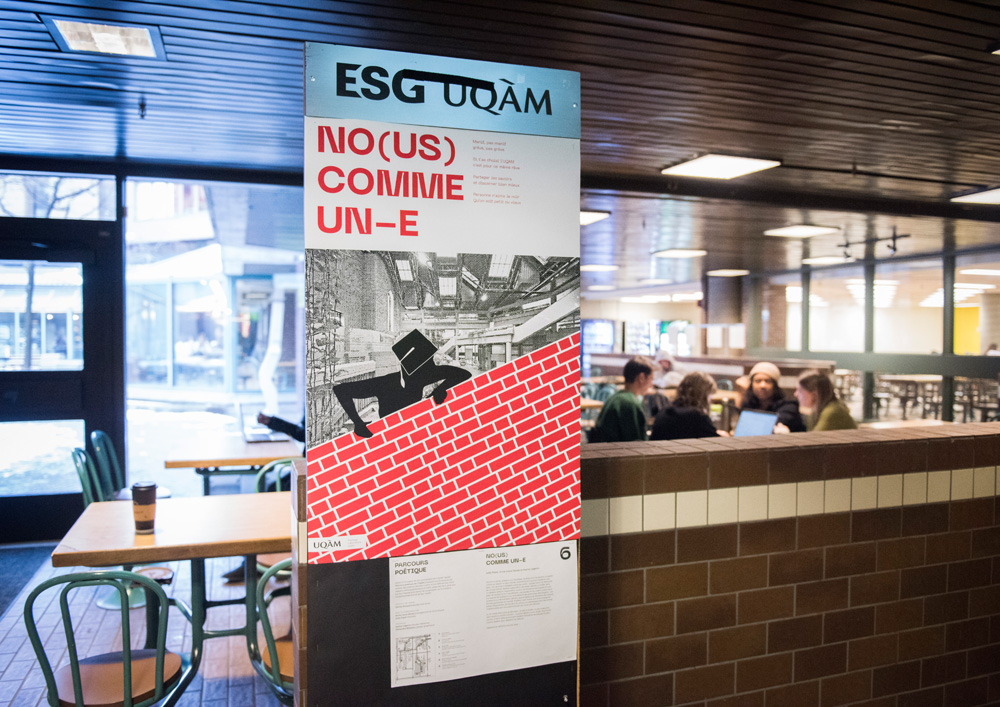 Le parcours est formé de six affiches-poèmes. Dans l’agora du pavillon Judith-Jasmin, l’affiche Vous êtes ici et le poème Marche au cœur de Montréal (Youssef Sawan, Matteo Esteves, Senda Mestiri) veulent exprimer le fait que le passage entre le métro et l’entrée de l’UQAM est une porte qui s’ouvre sur la connaissance.
