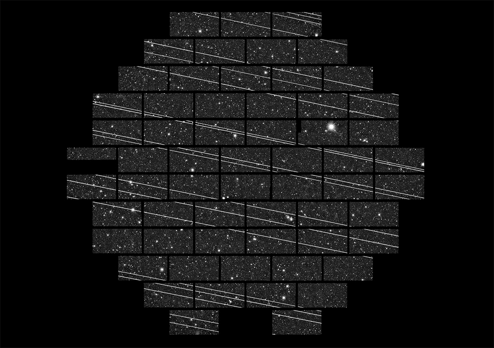 «Il y a de plus en plus de traînées qui apparaissent dans le viseur des télescopes en raison de la multiplication des satellites», constate avec inquiétude le professeur du Département de didactique Pierre Chastenay en observant 19 lignes blanches sur une image prise l’an dernier par deux astronomes de l’Observatoire interaméricain du Cerro Tololo, au Chili. Ces derniers indiquent qu’il s’agit vraisemblablement des satellites du projet Starlink mis en orbite la semaine précédente par l’entreprise SpaceX.