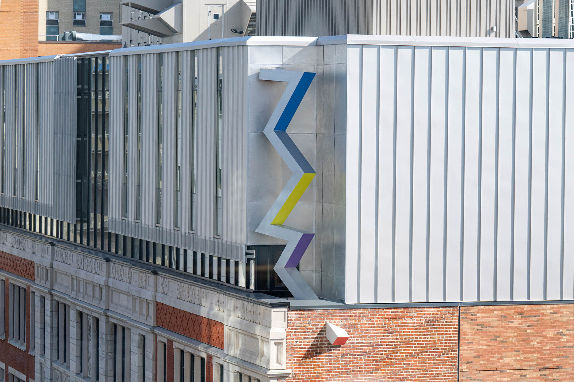 Sur la façade du nouveau pavillon de l’Entrepreneuriat et de l’innovation, une sculpture contemporaine en aluminium satiné aux couleurs éclatantes attire le regard: L’eurêka des singuliers, une création originale de Mathieu Lévesque, diplômé en arts visuels et médiatiques de l’UQAM.