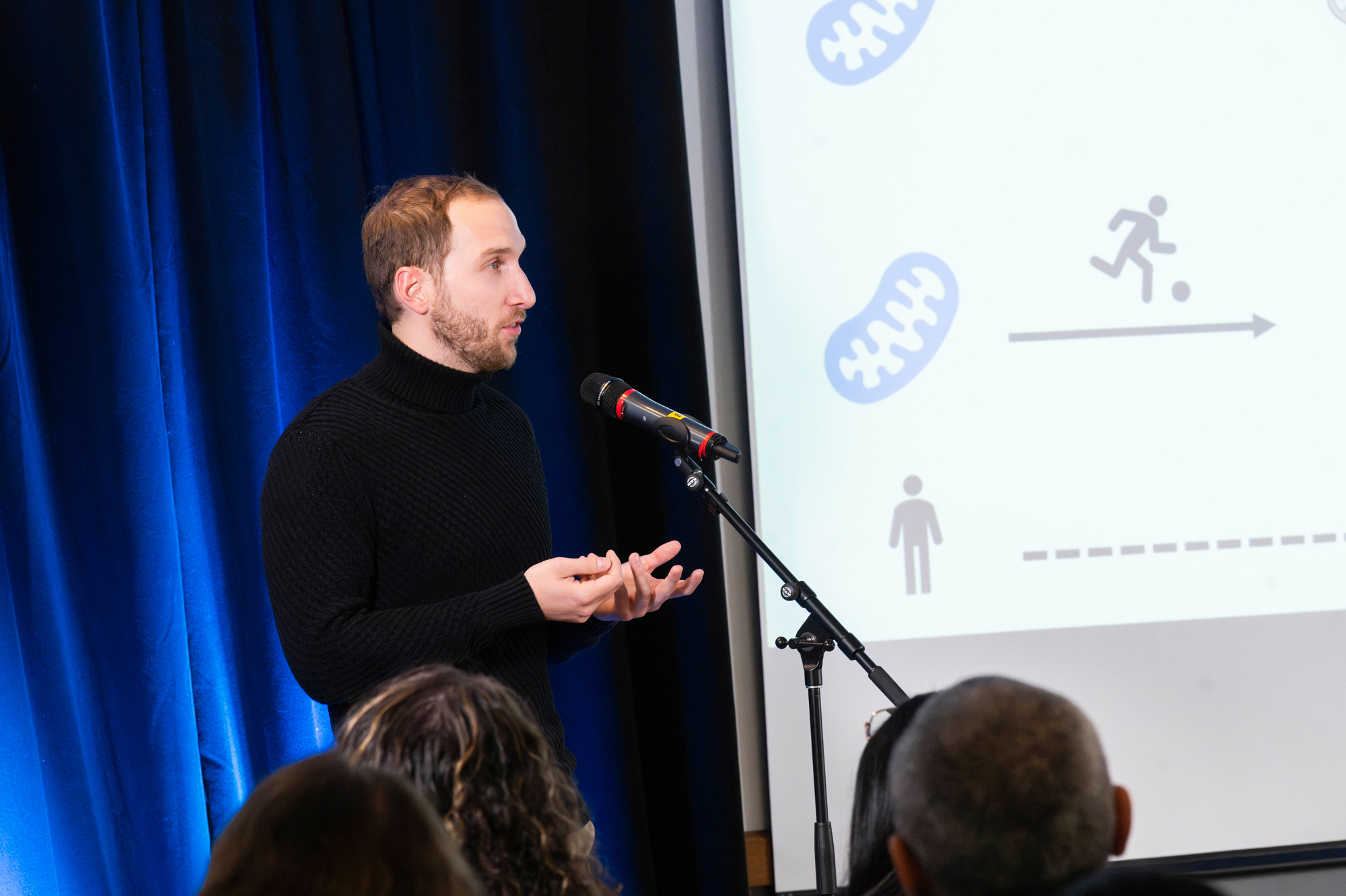 Le Prix du public a été décerné par la vice-rectrice à la Recherche, à la création et à la diffusion, Lucie Ménard, au doctorant en biologie Vincent Marcangeli (M.Sc. kinanthropologie), dont la thèse porte sur les effets de l’âge et de l’activité physique sur la santé musculaire et mitochondriale. Il obtient une bourse de 500 dollars.