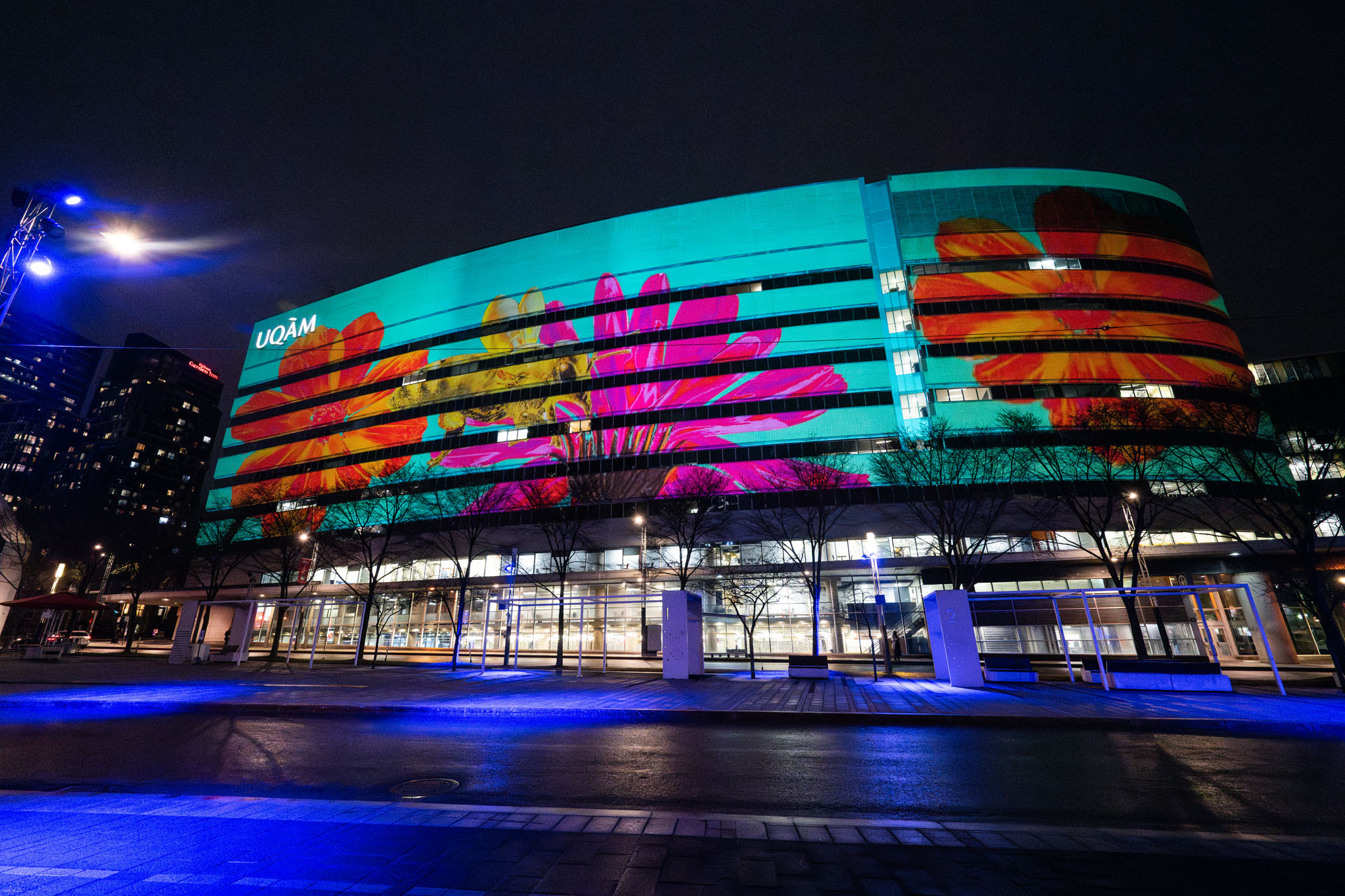 La façade du pavillon Président-Kennedy accueille une nouvelle vidéoprojection. Douceur radicale, composée de huit créations d’étudiantes et étudiants du cours Design des environnements immersifs, a été réalisée sous la supervision de la professeure de l’École de design Nelly-Ève Rajotte, du chargé de cours Patrice Coulombe et du mentor Gabriel Poirier-Galarneau. Les huit segments d’une minute chacun explorent l’image en mouvement comme vecteur de soin, de présence et de gestes sensibles.