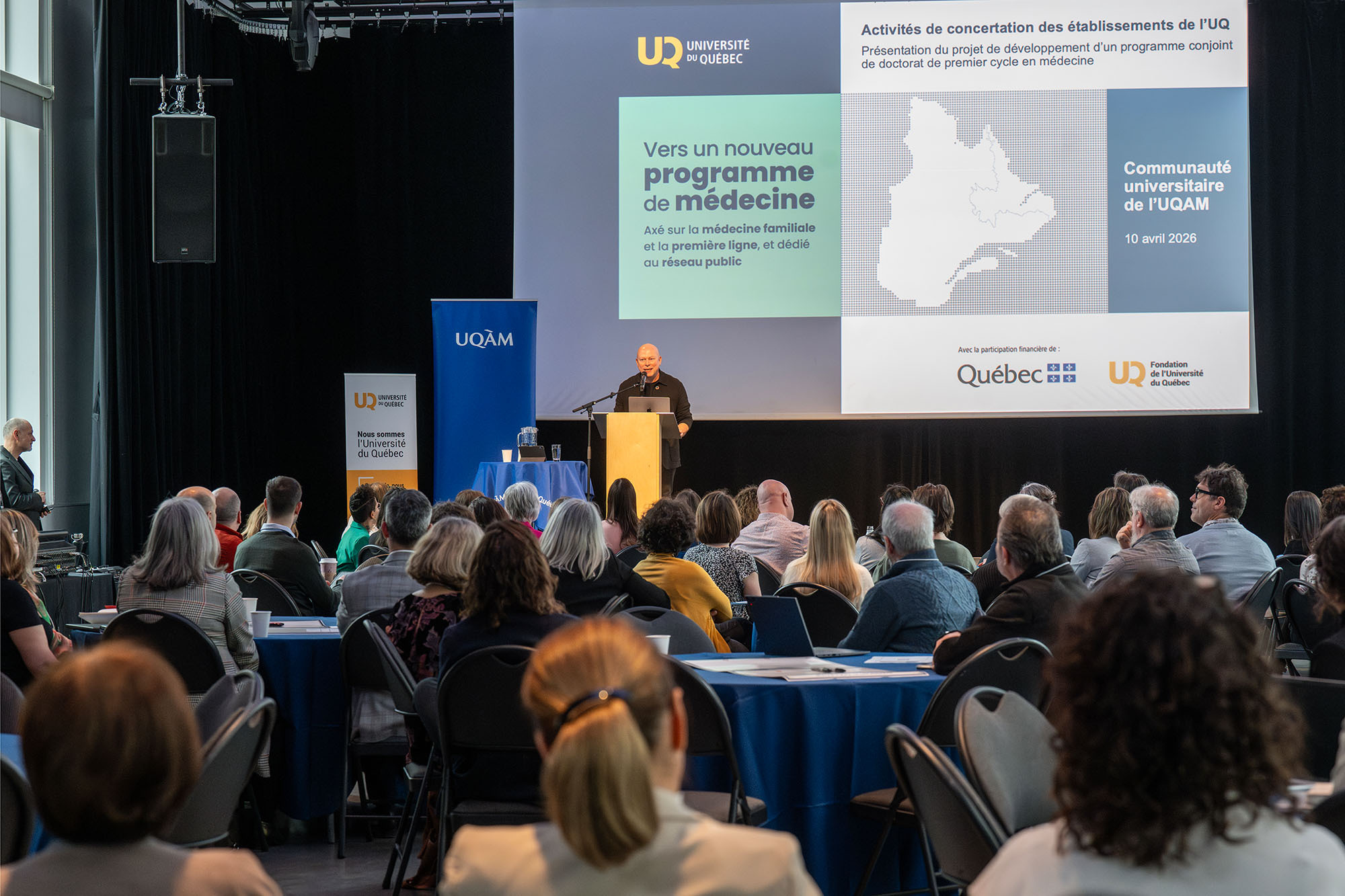 Dans le cadre du projet de développement d’un programme axé sur la médecine familiale et la première ligne, dédié au réseau public, l’Université du Québec (UQ) a organisé une tournée des établissements du réseau afin de permettre à chacun de contribuer à la réflexion sur le projet. L’activité de concertation qui avait lieu au Cœur des sciences de l’UQAM, le 10 avril dernier, constituait le dernier arrêt de cette tournée. Le recteur Stéphane Pallage a prononcé le mot d’ouverture de l’événement.