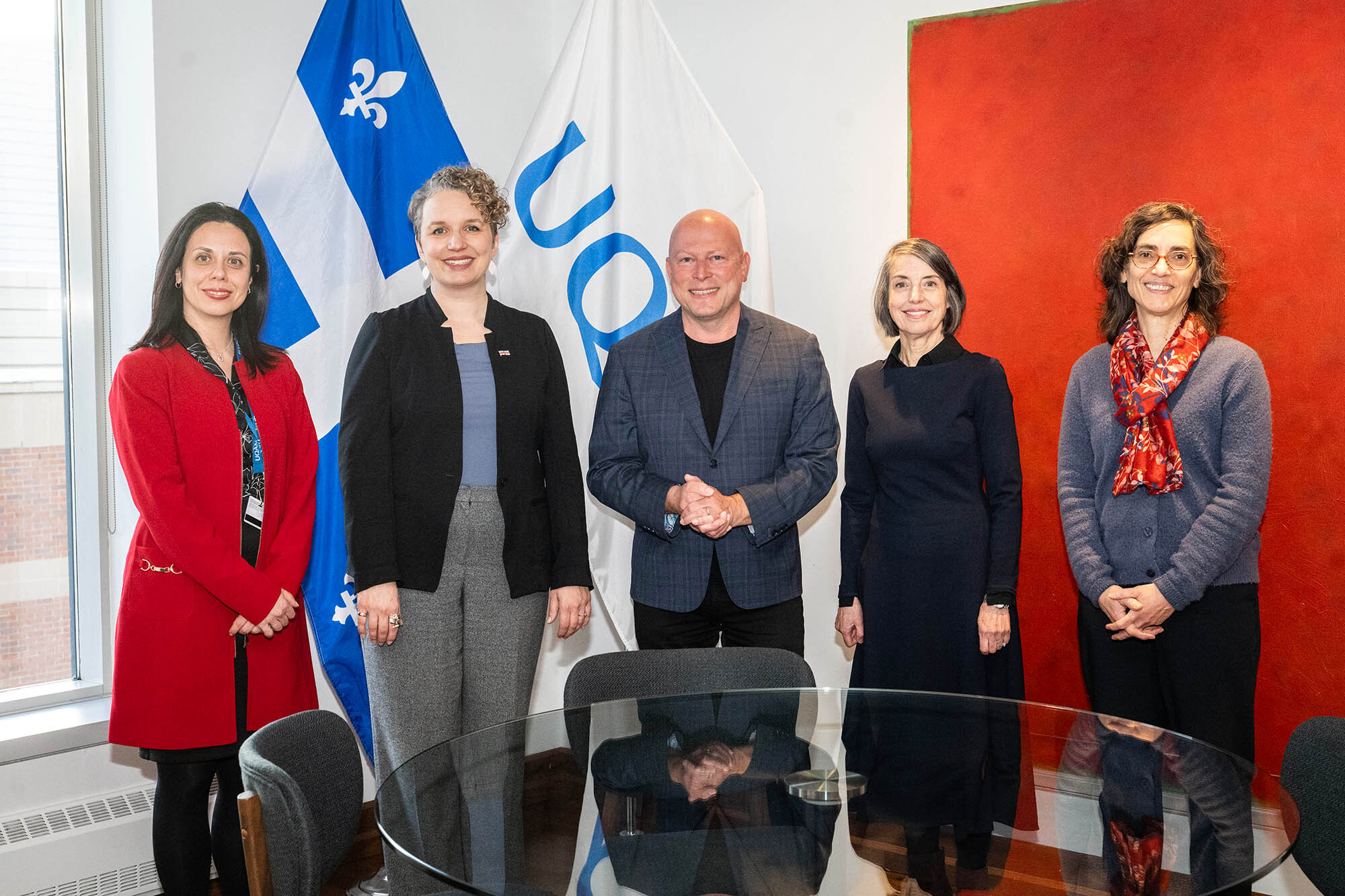 Andréanne Moreau (B.A. communication/journalisme), conseillère de la Ville du district Champlain-Île-des-Sœurs, dans l’Arrondissement de Verdun, et membre du Comité exécutif de la Ville de Montréal responsable de la culture, du patrimoine, du design et de la langue française, a été reçue par le recteur Stéphane Pallage et des membres de la direction, le 9 février dernier.