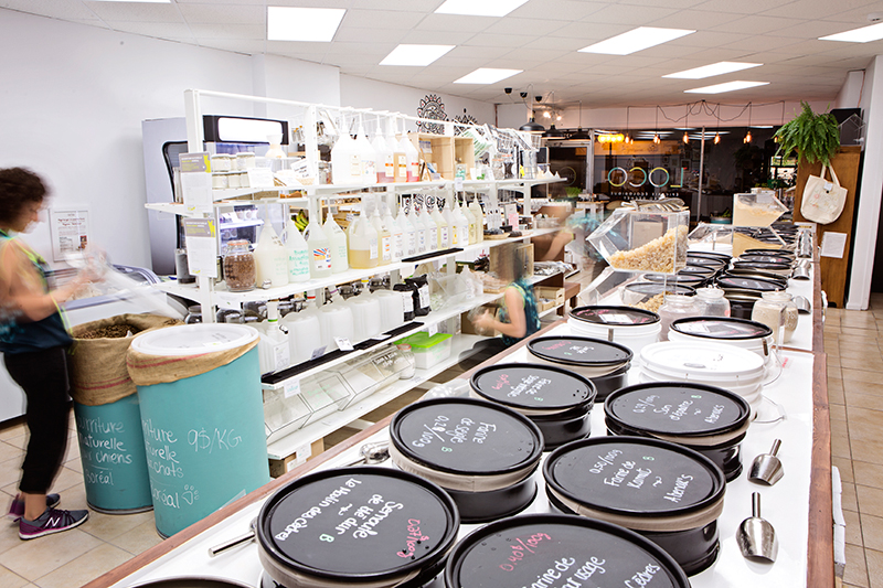 Ouvert sept jours sur sept, le local de 1000 pieds carrés offre des fruits et légumes, du yogourt et du lait en pot consignés, des farines, des fromages, des fauxmages de noix, des cosmétiques et des produits de nettoyage sans danger pour la santé et l’environnement, du kombucha en fût, des muffins, du pain et des croissants de la boulangerie montréalaise Le Pain dans les voiles, ainsi que des plats déjà préparés, comme ceux de l’entreprise locale Madame Virgule, qui tient kiosque les mercredis au Marché fermier de l’UQAM. «Le prêt-à-manger est très populaire! On a un comptoir style buffet avec des sandwiches et des salades», précise l’entrepreneuse.